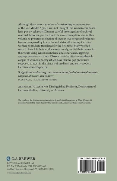 Although there were a number of outstanding women writers of the late middle ages, it was not thought that women composed lyric poetry. Classen proves this to be a misconception, presenting here a selection of secular love songs and religious hymns composed by fifteenth- and sixteenth-century German women poets, translated for the first time. Many seem to have left their works anonymously, or hid their names using acrostics; in these and other cases, Classen has identified a considerable corpus of writing which now fills the gap previously supposed to exist in the history of medieval and early-modern German women's poetry.