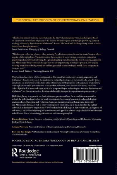 This book analyses three of the most prevalent illnesses of late modernity: anxiety, depression and Alzheimer's disease, in terms of their relation to cultural pathologies of the social body. Usually these conditions are interpreted clinically in terms of individualized symptoms and responded to discretely, as though for the most part unrelated to each other. However, these diseases also have a social and cultural profile that transcends their particular symptomologies and etiologies. Anxiety, depression and Alzheimer's are diseases related to disorders of the collective esprit de corps of contemporary society. Multidisciplinary in approach, the book addresses questions of how these conditions are manifest at both the individual and collective levels in relation to hegemonic biomedical and psychologistic understandings. Rejecting such reductive diagnoses, the authors argue that anxiety, depression and Alzheimer's disease, as well as other contemporary epidemics, are to be analysed in the light of individual and collective experiences of profound and radical changes in our civilization. A diagnosis of our times, Late Modern Subjectivity and its Discontents will appeal to a broad range of scholars with interests in health and illness, the sociology of medicine and contemporary life.