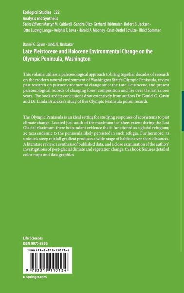 This study brings together decades of research on the modern natural environment of Washington's Olympic Peninsula, reviews past research on paleoenvironmental change since the Late Pleistocene, and finally presents paleoecological records of changing forest composition and fire over the last 14,000 years. The focus of this study is on the authors' studies of five pollen records from the Olympic Peninsula. Maps and other data graphics are used extensively. Paleoecology can effectively address some of these challenges we face in understanding the biotic response to climate change and other agents of change in ecosystems. First, species responses to climate change are mediated by changing disturbance regimes. Second, biotic hotspots today suggest a long-term maintenance of diversity in an area, and researchers approach the maintenance of diversity from a wide range and angles (CITE). Mountain regions may maintain biodiversity through significant climate change in 'refugia': locations where components of diversity retreat to and expand from during periods of unfavorable climate (Keppel et al., 2012). Paleoecological studies can describe the context for which biodiversity persisted through time climate refugia. Third, the paleoecological approach is especially suited for long-lived organisms. For example, a tree species that may typically reach reproductive sizes only after 50 years and remain fertile for 300 years, will experience only 30 to 200 generations since colonizing a location after Holocene warming about 11,000 years ago. Thus, by summarizing community change through multiple generations and natural disturbance events, paleoecological studies can examine the resilience of ecosystems to disturbances in the past, showing how many ecosystems recover quickly while others may not (Willis et al., 2010).