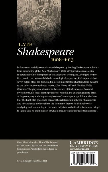 In fourteen specially commissioned chapters by leading Shakespeare scholars from around the globe, Late Shakespeare, 1608-1613 provides an essential reappraisal of the final phase of Shakespeare's writing life. Arranged for the first time in the best-established chronological sequence, Shakespeare's last seven extant plays are discussed in detail in dedicated chapters, from Pericles to the other late co-authored works, King Henry VIII and The Two Noble Kinsmen. The plays are situated in the context of Shakespeare's financial investments, his focus on the practice of reading, the changing nature of his acting company and the pressing issues of contemporary politics and urban life. The book also goes on to explore the relationship between Shakespeare and his audience and considers the dominant themes in his final works. Analysing and responding to the latest criticism in the field, this volume brings to light a vital re-examination of what it means to discuss 'late Shakespeare'.