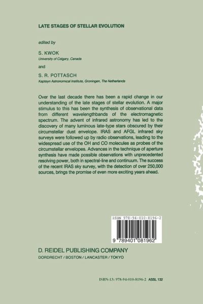 Over the last decade we have witnessed a rapid change in our understanding of the late stages of stellar evolution. A major stimulus to this has been the synthesis of observational data from different wavebands of the electromagnetic spectrum. The advent of infrared astronomy has led to the discovery of many luminous. late-type stars obscured by their circumstellar dust envelope. Sources discovered in the IRC and AFGL infrared sky surveys were followed up by radio observa tions, leading to the widespread use of the OH and CO molecules as probes of the circumstellar envelopes. Advances in the technique of aperture synthesis have made possible observations with unprecedent resolving power, both in spectral-line and continuum. The success of the recent IRAS sky survey, with the detection of over 250,000 sources, brings the promise of even more exciting years ahead. This area of astronomical research is also blessed with the close collaboration between theorists and observers. New ideas are constantly being quantitatively tested by new data. Theoretical predictions are eagerly used as guides for further observations. This conference was initiated with the following objective: bring together workers in optical, infrared, radio and theoretical astronomy and let them confront each other. Based on the post-conference res ponses we received, many of the participants have indeed found this Workshop a stimulating experience. The Workshop on the Late Stages of Stellar Evolution was held from 2-5 June 1986 in Calgary, Canada.