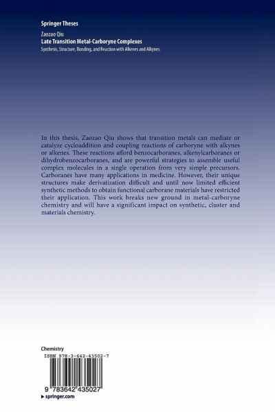 Zaozao Qiu shows in this thesis that transition metals can mediate or catalyze the cycloaddition or coupling reactions of carboryne with alkynes or alkenes to afford benzocarboranes, alkenylcarboranes or dihydrobenzocarboranes. These results represent powerful strategies to assemble useful complex molecules from very simple precursors in a single operation. Carboranes have many applications in medicine. However, their unique structures make derivatization difficult and the limited efficient synthetic methods to obtain functional carborane materials have restricted applications of carboranes within a narrow scope. This work breaks a new ground in metal-carboryne chemistry and will have a significant impact on synthetic, cluster and materials chemistry.
