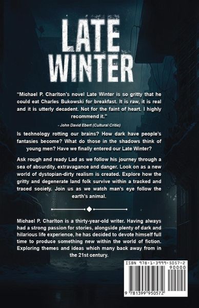 "Michael P. Charlton's novel Late Winter is so gritty that he could eat Charles Bukowski for breakfast. It is raw, it is real and it is utterly decadent. Not for the faint of heart. I highly recommend it." - JOHN DAVID EBERT, CULTURAL CRITIC "Late Winter is an unusually strong literary debut; an artistic statement that has the reader turning the page as his characters plummet ever deeper into hell. Michael P. Charlton has a skill for writing rich dialogue, likeable characters and memorable conflicts, the relationships enriched by violence and tenderness." - JAMES ANDERS BANKS, BOOKER PRIZE LISTED AWARD-WINNING NOVELIST "Charlton has crafted a novel that smacks of originality. Charlton's prose is shockingly raw, delivered throughout in choppy bites. The novel has a decidedly tongue-in-cheek feel and the prose is designed to reflect the depravity, listlessness, and self-loathing of the characters." - BOOKLIFE PRIZE "Charlton commits to it all being a highly inventive ordeal, a soiling, not-for-the-squamish spree abounding in gore, filth, viciously off-kilter monologues, and bizarre sexual escapades. The result may pleasingly jolt readers who favour poetic squalor." - PUBLISHERS WEEKLY "The exploration of a society's moral decay, intertwined with the characters' descent into darkness, creates a haunting and thought-provoking read. One of the strengths of Charlton's work lies in his ability to create a cast of deeply flawed characters, each grappling with their unique set of issues." - DISCOVERY REVIEW Late Winter will grab you by the throat and drag you into the totalitarian darkness. A darkness which very few writers are willing to face. DRUGS, CRIME, LOVE, FAMILY, DIGITAL HELL, ESCAPE... Is technology rotting our brains? Ask rough and ready Lad as we follow his journey through a sea of absurdity, extravagance and danger. Look on as a new world of dystopian-dirty realism is created. Explore how the gritty and degenerate land folk survive within a tracked and traced society. Join us as we watch man's eye follow the earth's animal.
