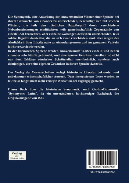 Dieses Buch über die lateinische Synonymik, nach Gardin-Dumesnil's "Synonymes Latins", ist ein unveränderter, hochwertiger Nachdruck der Originalausgabe von 1833.