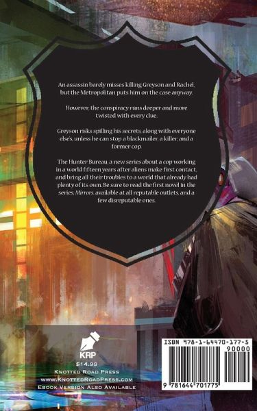 An assassin barely misses killing Greyson and Rachel, but the Metropolitan puts him on the case anyway. However, the conspiracy runs deeper and more twisted with every clue. Greyson risks spilling his secrets, along with everyone else's, unless he can stop a blackmailer, a killer, and a former cop. The Hunter Bureau, a new series about a cop working in a world fifteen years after aliens make first contact, and bring all their troubles to a world that already had plenty of its own. Be sure to read the first novel in the series, Mirrors, available at all reputable outlets, and a few disreputable ones.