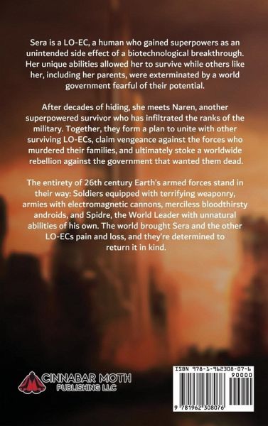 Sera is a LO-EC, a human who gained superpowers as an unintended side effect of a biotechnological breakthrough. Her unique abilities allowed her to survive while others like her, including her parents, were exterminated by a world government fearful of their potential. After decades of hiding, she meets Naren, another superpowered survivor who has infiltrated the ranks of the military. Together, they form a plan to unite with other surviving LO-ECs, claim vengeance against the forces who murdered their families, and ultimately stoke a worldwide rebellion against the government that wanted them dead. The entirety of 26th century Earth's armed forces stand in their way: Soldiers equipped with terrifying weaponry, armies with electromagnetic cannons, merciless bloodthirsty androids, and Spidre, the World Leader with unnatural abilities of his own. The world brought Sera and the other LO-ECs pain and loss, and they're determined to return it in kind.