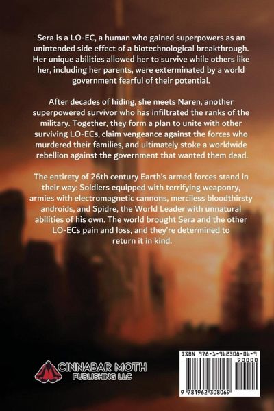 Sera is a LO-EC, a human who gained superpowers as an unintended side effect of a biotechnological breakthrough. Her unique abilities allowed her to survive while others like her, including her parents, were exterminated by a world government fearful of their potential. After decades of hiding, she meets Naren, another superpowered survivor who has infiltrated the ranks of the military. Together, they form a plan to unite with other surviving LO-ECs, claim vengeance against the forces who murdered their families, and ultimately stoke a worldwide rebellion against the government that wanted them dead. The entirety of 26th century Earth's armed forces stand in their way: Soldiers equipped with terrifying weaponry, armies with electromagnetic cannons, merciless bloodthirsty androids, and Spidre, the World Leader with unnatural abilities of his own. The world brought Sera and the other LO-ECs pain and loss, and they're determined to return it in kind.