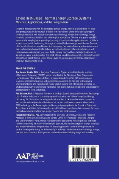 Amritanshu Shukla, PhD, is Associate Professor in Physics at the Rajiv Gandhi Institute of Petroleum Technology (RGIPT), where he is Head of the Division of Basic Sciences and Humanities and Chief Vigilance Officer. He has published more than 100 research papers in various international journals and conference proceedings. He has also written several international books and has delivered invited talks at national and international institutes. Dr. Shukla is also involved with several national as well as international projects and active research collaborations in India and abroad. Atul Sharma, PhD, is Associate Professor at the Rajiv Gandhi Institute of Petroleum Technology, Uttar Pradesh, India, and is conducting research at the institute's Non-Conventional Energy Laboratory. Dr. Sharma has recently published an edited book as well as research papers in various international journals and conferences. He also holds several patents related to the PCM technology in the Taiwan region and is currently engaged with the Council of Science & Technology. In addition, he has served as an editorial board member and as a reviewer for many national and international journals, project reports, and book chapters. Pascal Henry Biwolé, PhD, is Professor at the Université Clermont Auvergne and Research Associate at MINES ParisTech Graduate School, Center for Processes, Renewable Energies and Energy Systems, Paris, France. His research interests are the modeling of heat and mass transfers in building innovative envelopes and systems, the modeling of phase change materials and aerogel-based insulating materials for energy applications, and the development of 3D particle tracking velocimetry for airflow study in buildings. He teaches on thermal energy storage, heat and mass transfers, fluid dynamics, and environmental building design and modeling.