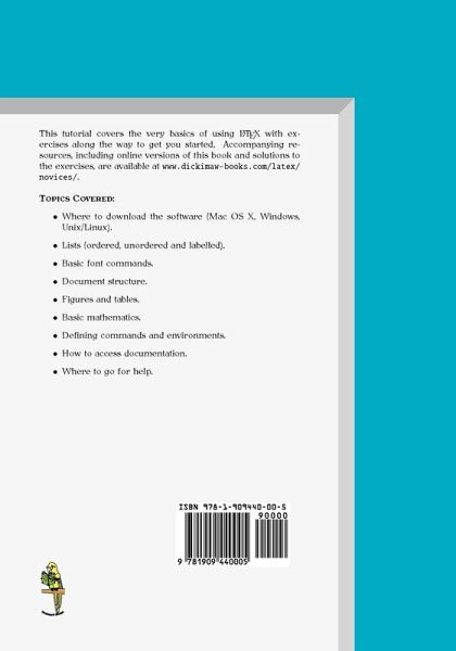 A tutorial that covers the very basics of using the LaTeX computer typesetting system with exercises to get the reader started. Accompanying resources and solutions to the exercises are available from the book's home page at www.dickimaw-books.com/latex/novices/.