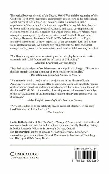 The aim of this volume is to establish that the period between the end of the Second World War and the beginning of the Cold War (1944-5 to 1947-8), hitherto neglected, represents an important conjuncture in the political and social history of Latin America in the twentieth century. The volume contains, besides an introduction and a conclusion by the editors, case studies of eleven of the twenty Latin American republics. Despite differences of political regime, different levels of economic and social development, and different relations with the region's hegemonic power - the United States - there are striking similarities in the experiences of the majority of the Latin American republics in this period. For most of Latin America it can be divided into two phases. The first, coinciding with the Allied victory in the Second World War, was characterized by three distinct but interrelated phenomena: democratization, with a relatively high level of middle-class and working-class participation; a shift to the Left, both communist and noncommunist; and unprecedented labor militancy. In the second phase, coinciding with the onset of the Cold War and completed almost everywhere by 1948, labor was disciplined by the state and in many cases excluded from politics; communist parties almost everywhere suffered proscription and severe repression; reformist, "progressive" parties moved to the Right - the democratic advance was for the most part contained, and in some cases reversed. An opportunity, however limited, for significant political and social change, as well as for the first steps perhaps toward a Latin American version of social democracy, was lost. Instead, the institutional andideological foundations were laid for Latin America's postwar "model" of economic growth without equity within a context of, at best, fragile and intermittent democracy.