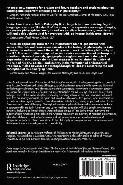 Introduction Robert Eli Sanchez, Jr. Chapter 1: Philosophy without Europe James Maffie Chapter 2: "The Indian Problem": Conquest and the Valladolid Debate Alejandro Santana Chapter 3: The Continental Struggle for Democracy: The American Wars of Independence as Experiments in Justice Jose-Antonio Orosco Chapter 4: Nation-Building through Education: Positivism and its Transformations in Mexico Alexander V. Stehn Chapter 5: The Philosophy of Mexican Culture Robert Eli Sanchez, Jr. Chapter 6: Mexican Existentialism Carlos Alberto Sánchez Chapter 7: Liberation Philosophy Grant Silva Chapter 8: Latin American and Latinx Feminisms Stephanie Rivera Berruz Chapter 9: Indigenism in Peru and Bolivia Kim Díaz Chapter 10: Latinx Philosophy and the Ethics of Migration José Jorge Mendoza Chapter 11: Latinx Identity Andrea Pitts Chapter 12: Metaphilosophy: Defining Latin American and Latinx Philosophy Lori Gallegos de Castillo and Francisco Gallegos