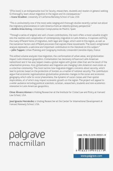 This edited volume analyzes how migration, the conformation of urban areas, and globalization impact Latin American geopolitics. Globalization has decisively influenced Latin American nationhood and it has also helped create a global region with global cities that are the result of the urbanization process. Also, globalization and migration are changing Latin America's own vision as a collective community. This book tackles how migration triggers concerns about security, which lead to policies based on the protection of borders as a matter of national security. The contributors argue that economic regionalization-globalization promotes changes in the social and economic geography which refer to social phenomena, the dynamic of social classes and their spatial implications, all of which may impact economic growth on the region. The project will appeal to a wider audience including political scientists, scholars, researchers, students and non-academics interested in Latin American geopolitics.