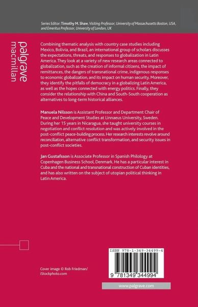Latin America's Political and Economic Responses to the Process of Globalization; R.Bernal-Meza & S.Fryba Christensen Energy Policy and 21st Century Globalization: The Responses of Brazil and Venezuela, and Opportunities for Renewable Energy Development in the Americas; E.Brand & M.Schewel Remittances and Social Development: The Latin American Experience; M.Orozco Globalization and the Formation of the Political Left in Latin America; M.Nilsson Global discourses, Local Meanings; Indigenous and Nationalistic Responses to Neoliberal Globalization in Bolivia; A.Jeppesen Between God and the State: Globalization and Human Insecurity in Latin America; A.Pérez-Baltodano Unintended Exports: The Globalization of the Mara Salvatrucha; T.Stiles Globalization, Transition, and Insecurity in Mexico; P.Olney New Patterns of Violence in Latin America; D.Kruijt Latin American and European Relations in an Age of Uncertainty and Opportunity; G.Edwards & E.Mendizabal China and Latin America: What Sort ofFuture?; W.Ratliff South-South Relations in Brazil's Response to the Challenges of Globalization; S.Christensen Conclusions: Latin America and Globalization - Challenges, Responses and Perspectives in the 21st Century; J.Gustafsson & M.Nilsson