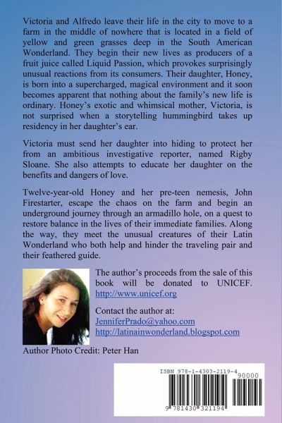 Author's Proceeds Donated to UNICEF. Victoria and Alfredo move from the city to a Latin version of Wonderland and produce a juice called Liquid Passion that provokes unusual reactions in its consumers. Their twelve-year-old daughter, Honey, has a hummingbird living in her ear and possesses magical powers. Hungry for a story, an investigative reporter named Rigby Sloane, shows up and launches an international media frenzy. Honey and her pre-teen nemesis, John Firestarter, escape the chaos on her parents' farm and begin an underground journey; through an armadillo hole, on a quest to restore balance in the lives of their immediate families.
