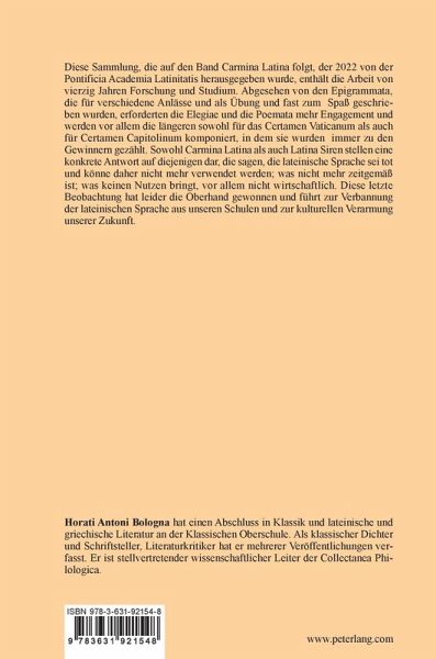 Diese Sammlung, die auf den Band Carmina Latina folgt, der 2022 von der Pontificia Academia Latinitatis herausgegeben wurde, enthält die Arbeit von vierzig Jahren Forschung und Studium. Abgesehen von den Epigrammata, die für verschiedene Anlässe und als Übung und fast zum Spaß geschrieben wurden, erforderten die Elegiae und die Poemata mehr Engagement und werden vor allem die längeren sowohl für das Certamen Vaticanum als auch für Certamen Capitolinum komponiert, in dem sie wurden immer zu den Gewinnern gezählt. Sowohl Carmina Latina als auch Latina Siren stellen eine konkrete Antwort auf diejenigen dar, die sagen, die lateinische Sprache sei tot und könne daher nicht mehr verwendet werden; was nicht mehr zeitgemäß ist; was keinen Nutzen bringt, vor allem nicht wirtschaftlich. Diese letzte Beobachtung hat leider die Oberhand gewonnen und führt zur Verbannung der lateinischen Sprache aus unseren Schulen und zur kulturellen Verarmung unserer Zukunft.