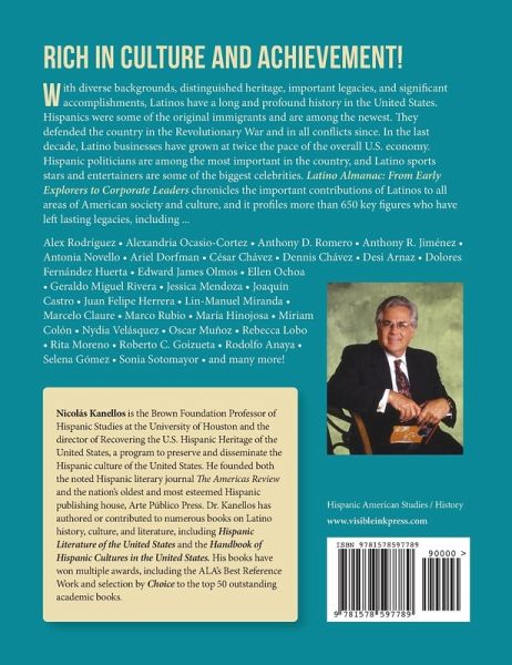 A celebration of people and pride! Explore the achievements and contributions of Latinos in the United States with this illuminating history. Latinos in the United States are a vibrant mix of people and multiple identities, each unique, varied, and accomplished. Beginning with the Spanish explorers in the sixteenth century, Latinos have been an important part of American society. They've fought the Revolutionary War, the Civil War, and all wars in between and since, and in the last decade, their businesses have grown at twice the pace of the overall U.S. economy. The most complete and affordable single-volume reference on Latino history available today, Latino Almanac: From Early Explorers to Corporate Leaders honors the history and the impact of Latinos on the United States. This hefty tome is a fascinating mix of biographies, little-known or misunderstood historical facts, and enlightening essays on significant legislation, movements, current issues, and achievements across a variety of fields, including business, labor, politics, the military, music, sports, law, media, religion, art, literature, theater, film, science, technology, and medicine. A large collection of 650 biographies includes both celebrated and lesser-known Latino stars, such as Dolores Fernáaacute;ndez Huerta, labor leader Sonia Sotomayor, Supreme Court justice Juan Felipe Herrera, U.S. poet laureate Roberto C. Goizueta, businessperson, former CEO of Coca-Cola Selena Góoacute;mez, actor, singer, producer Rebecca Lobo, basketball player, sports analyst Anthony D. Romero, executive director of the American Civil Liberties Union (ACLU) Alexandria Ocasio-Cortez, U.S. congressperson Ellen Ochoa, astronaut, engineer Anthony R. Jiméeacute;nez, entrepreneur Maríiacute;a Hinojosa, journalist Dennis Chávez, U.S. senator Oscar Muñntilde;oz, businessperson, CEO United Airlines Antonia Novello, surgeon general of the United States Geraldo Miguel Rivera, journalist Lin-Manuel Miranda, playwright, actor, director Alex Rodríguez, baseball player Rodolfo Anaya, novelist Desi Arnaz, television producer, actor, singer Jessica Mendoza, sportscaster, softball player Nydia Velásquez, U.S. congressperson Edward James Olmos, actor Marco Rubio, U.S. senator Rita Moreno, actor, dancer César Chávez, labor leader Marcelo Claure, businessperson, former Sprint CEO Ariel Dorfman, playwright, novelist Miriam Colón, actress, theater owner, producer Joaquín Castro, chair of the Hispanic Congressional Caucus And many, many more! While Latinos are among both the original and newest immigrants, today the majority of U.S. Latinos were born here and most speak English-although most are bilingual to one degree or another. Their influence on the economy and culture continues to increase. Their impact on the United States has been wide-ranging. Salsa has even overtaken ketchup to become the most popular condiment in the United States! Devoted to illustrating the moving and often lost history of Latinos in America, Latino Almanac is a unique and valuable resource. Numerous photographs and illustrations, a helpful bibliography, a timeline, and an extensive index add to its usefulness. Commemorating and honoring Latino achievements, honors, and influence, th