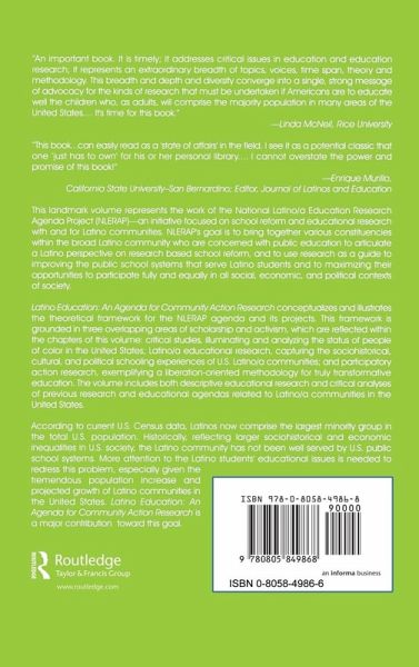 According to current U.S. Census data, Latinos now comprise the largest minority group in the total U.S. population. Historically, reflecting larger sociohistorical and economic inequalities in U.S. society, the Latino community has not been well served by U.S. public school systems. More attention to the Latino students' educational issues is needed to redress this problem, especially given the tremendous population increase and projected growth of Latino communities in the U.S. Latino Education: An Agenda for Community Action Research is a major contribution toward this goal.