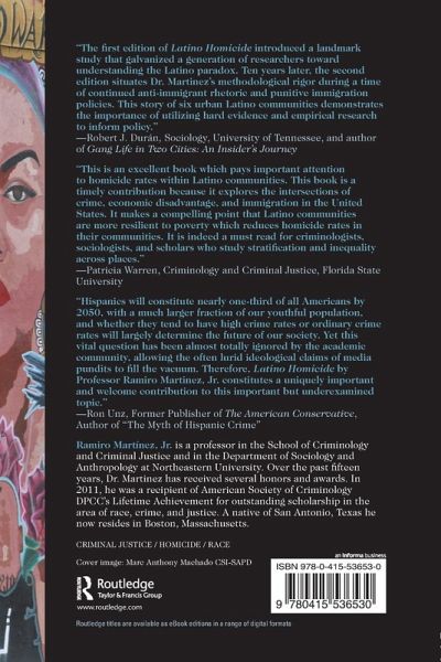 Latino Homicide is the first empirically based, but readable book for courses to counter the conventional wisdom that immigrant populations only contribute crime to their communities. For this second edition, Martinez further emphasizes his argument with updated data and the addition of a new city, San Antonio. With fascinating case studies from police reports and actual cases from six varied cities, Latino homicide rates are revealed to be markedly lower than one would expect, given the economic deprivation of these urban areas. Far from dangerous or criminal, these communities often have exceptionally strong social networks precisely because of their shared immigrant experiences. Martinez skillfully refutes negative stereotypes in a coherent and critically rigorous analysis of the issues.