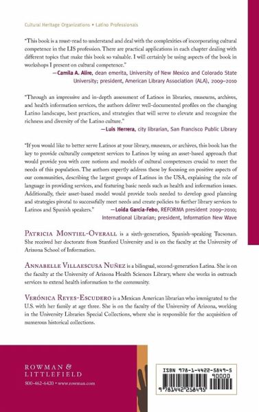 Written by three experienced LIS professionals, Latinos in Libraries, Museums, and Archives demonstrates the meaning of cultural competence in the everyday work in libraries, archives, museums, and special collections with Latino populations.