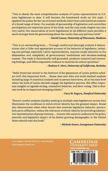 In one of the only accounts of Latino legislative behavior, Stella M. Rouse examines how well the growing Latino population translates their increased presence into legislative influence. Latinos in the Legislative Process explores Latino representation by considering the role of ethnicity throughout the legislative process - from bill sponsorship, to committee deliberations, to floor votes - in seven state legislatures. Rouse first identifies issues that are priorities for Latinos and tells us whether a Latino political agenda exists. She then provides a theoretical framework for ethnicity in legislative behavior and outcomes. Rouse demonstrates that ethnicity is a complex dynamic that plays a variable role in the legislative process. Thus, Latino representation cannot be viewed monolithically.