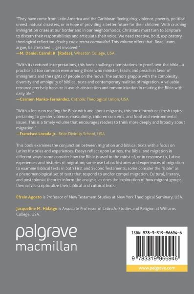 This book examines the conjunction between migration and biblical texts with a focus on Latinx histories and experiences. Essays reflect upon Latinxs, the Bible, and migration in different ways: some consider how the Bible is used in the midst of, or in response to, Latinx experiences and histories of migration; some use Latinx histories and experiences of migration to examine Biblical texts in both First and Second Testaments; some consider the "Bible" as a phenomenological set of texts that respond to and/or compel migration. Cultural, literary, and postcolonial theories inform the analysis, as does the exploration of how migrant groups themselves scripturalize their biblical and cultural texts.