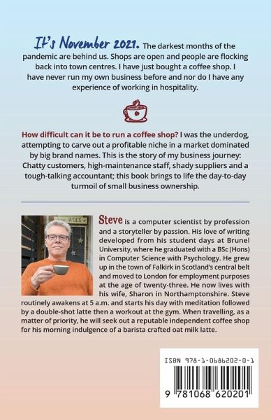 It's November 2021, and I have just bought a coffee shop. I have never run my own business before and nor do I have any experience of working in hospitality. How hard can it be to run a coffee shop? Pulling espresso shots is easy, it's the chatty customers, shady suppliers, needy staff and a tough-talking accountant that makes this an experience worth writing about. This is the story of my business journey, from start-up to exit. This book covers the stresses of small business ownership and recounts the thrills and spills of day-to-day life in a busy coffee shop.