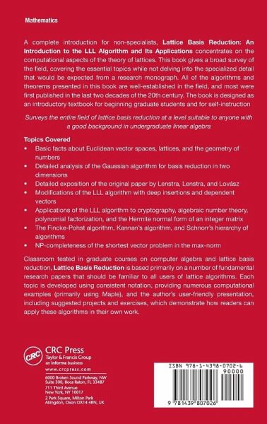 First developed in the early 1980s by Lenstra, Lenstra, and Lov sz, the LLL algorithm was originally used to provide a polynomial-time algorithm for factoring polynomials with rational coefficients. It very quickly became an essential tool in integer linear programming problems and was later adapted for use in cryptanalysis. This book provides an introduction to the theory and applications of lattice basis reduction and the LLL algorithm. With numerous examples and suggested exercises, the text discusses various applications of lattice basis reduction to cryptography, number theory, polynomial factorization, and matrix canonical forms.