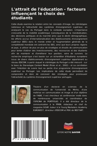 Cette étude examine la relation entre les concepts d'image, les stéréotypes nationaux et l'attractivité des systèmes d'enseignement supérieur, en analysant le cas du Portugal dans le contexte européen. L'importance croissante de la mobilité académique (conséquence de la mondialisation, des décisions politiques et du marché) ainsi que le déclin démographique, les efforts accrus d'internationalisation des établissements d'enseignement supérieur (EES) dans le monde entier et l'augmentation générale de la compétitivité mondiale ont contraint les EES, ainsi que leurs propres régions et pays, à utiliser de plus en plus de stratégies et d'outils de communication pour tenter d'attirer des investissements, des ressources et des étudiants afin de maintenir et d'améliorer leur position, voire de survivre. La recherche empirique s'est basée sur un échantillon d'étudiants européens issus de divers établissements d'enseignement supérieur appartenant au réseau EDCOM, à partir duquel le stéréotype du Portugal a été mesuré - sur la base du Stereotype Content Model (Fiske et al., 2002) - et sa corrélation avec l'intention de suivre tout ou partie d'un programme d'enseignement supérieur au Portugal. Les implications de cette étude permettent de comprendre et donc de concevoir des stratégies pour promouvoir l'attractivité du système d'enseignement supérieur portugais.
