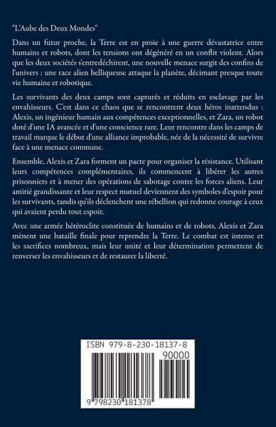 "L'Aube des Deux Mondes" Dans un futur proche, la Terre est en proie à une guerre dévastatrice entre humains et robots, dont les tensions ont dégénéré en un conflit violent. Alors que les deux sociétés s'entredéchirent, une nouvelle menace surgit des confins de l'univers : une race alien belliqueuse attaque la planète, décimant presque toute vie humaine et robotique. Les survivants des deux camps sont capturés et réduits en esclavage par les envahisseurs. C'est dans ce chaos que se rencontrent deux héros inattendus : Alexis, un ingénieur humain aux compétences exceptionnelles, et Zara, un robot doté d'une IA avancée et d'une conscience rare. Leur rencontre dans les camps de travail marque le début d'une alliance improbable, née de la nécessité de survivre face à une menace commune. Ensemble, Alexis et Zara forment un pacte pour organiser la résistance. Utilisant leurs compétences complémentaires, ils commencent à libérer les autres prisonniers et à mener des opérations de sabotage contre les forces aliens. Leur amitié grandissante et leur respect mutuel deviennent des symboles d'espoir pour les survivants, tandis qu'ils déclenchent une rébellion qui redonne courage à ceux qui avaient perdu tout espoir. Avec une armée hétéroclite constituée de humains et de robots, Alexis et Zara mènent une bataille finale pour reprendre la Terre. Le combat est intense et les sacrifices nombreux, mais leur unité et leur détermination permettent de renverser les envahisseurs et de restaurer la liberté.