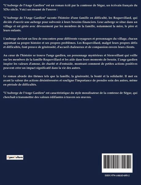 "L'Auberge de l'Ange Gardien" est un roman écrit par la comtesse de Ségur, un écrivain français du XIXe siècle. Voici un résumé de l'¿uvre : "L'Auberge de l'Ange Gardien" raconte l'histoire d'une famille en difficulté, les Roquevillard, qui décide d'ouvrir une auberge pour subvenir à leurs besoins financiers. Leur auberge se situe dans un village et est gérée avec dévouement par les membres de la famille, notamment la mère, le père et leurs enfants. L'auberge devient un lieu de rencontres pour différents voyageurs et personnages du village, chacun apportant sa propre histoire et ses propres problèmes. Les Roquevillard, malgré leurs propres défis et difficultés, font preuve de générosité, d'accueil chaleureux et de compassion envers leurs clients. Au c¿ur de l'histoire se trouve l'ange gardien, un personnage mystérieux et bienveillant qui veille sur les membres de la famille Roquevillard et les aide dans leurs moments de besoin. L'ange gardien inspire les valeurs d'amour, de charité et d'entraide, montrant comment de petites actions positives peuvent créer un impact significatif dans la vie des autres. Le roman aborde des thèmes tels que la famille, la générosité, la bonté et la solidarité. Il met en avant la valeur des actions désintéressées et souligne l'importance de prendre soin des autres, même en période de difficultés. "L'Auberge de l'Ange Gardien" est caractéristique du style moralisateur de la comtesse de Ségur, qui cherchait à transmettre des valeurs édifiantes à travers ses ¿uvres.