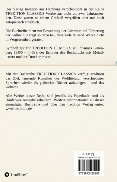 Dieses Werk ist Teil der Buchreihe TREDITION CLASSICS. Der Verlag tredition aus Hamburg veröffentlicht in der Buchreihe TREDITION CLASSICS Werke aus mehr als zwei Jahrtausenden. Diese waren zu einem Großteil vergriffen oder nur noch antiquarisch erhältlich. Mit der Buchreihe TREDITION CLASSICS verfolgt tredition das Ziel, tausende Klassiker der Weltliteratur verschiedener Sprachen wieder als gedruckte Bücher zu verlegen und das weltweit! Die Buchreihe dient zur Bewahrung der Literatur und Förderung der Kultur. Sie trägt so dazu bei, dass viele tausend Werke nicht in Vergessenheit geraten.