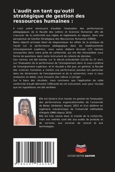 Il s'est avéré nécessaire d'auditer l'évaluation des performances pédagogiques de la Faculté des Lettres et Sciences Humaines afin de s'assurer de la conformité aux règles et règlements en vigueur, dans une perspective de Gestion Stratégique des Ressources Humaines (GRSH).Notre objectif principal étant de diagnostiquer les effets de la pratique de l'audit sur la performance pédagogique dans les établissements d'enseignement supérieur, nous avons élaboré dix-sept (17) normes incorporées dans notre grille de conformité, qui ont été retravaillées sous forme de questions dans notre instrument de collecte de données.Ces normes ont été basées sur le décret présidentiel 121/20 du 27 avril, sur l'évaluation de la performance de l'enseignement dans le sous-système de l'enseignement supérieur, et le résultat a été que, en général, la Faculté des sciences humaines a montré une performance positive (en particulier dans les dimensions de l'enseignement et de la recherche), mais si nous analysons en détail, nous trouvons des indices à corriger.Sur la base des résultats, nous concluons que l'application de cette conformité d'audit démontre l'efficacité de cet instrument, avec pour résultat que les hypothèses ont été vérifiées.