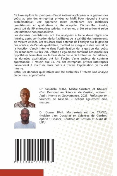 Ce livre explore les pratiques d'audit interne appliquées à la gestion des coûts au sein des entreprises privées au Mali. Pour répondre à cette problématique, une approche mixte combinant des méthodes quantitatives et qualitatives a été adoptée. L'échantillon étudié, constitué de 99 entreprises privées maliennes, a été sélectionné selon une méthode non probabiliste.Les données quantitatives ont été analysées à l'aide d'une régression linéaire, après vérification de la fiabilité et de la validité des instruments de mesure utilisés. Les résultats ainsi obtenus de l'analyse sur la gestion des coûts et de l'étude qualitative, mettent en exergue le rôle central de la fonction d'audit interne dans l'optimisation de la gestion des coûts (40 répondants sur les 99). L'étude a également confirmé l'ensemble des hypothèses formulées sur la base de la revue de littérature. Par ailleurs, les données qualitatives ont fait l'objet d'une analyse de contenu approfondie. Il ressort que 94, 7% des entreprises privées interrogées parviennent à maitriser leurs coûts à travers l'application de l'audit interne.Enfin, les données qualitatives ont été exploitées à travers une analyse de contenu approfondie.
