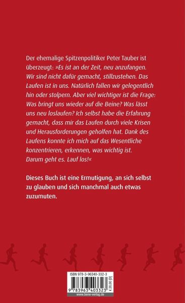 Der ehemalige Spitzenpolitiker Peter Tauber hat selbst erfahren: Wenn es im Leben wieder einmal richtig dicke kommt, dann heißt es für ihn Lauf los! Sein Buch über die Erfahrung und Lebenskunst, laufend neu aufzubrechen ist eine Ermutigung, an sich selbst zu glauben, sich etwas zuzutrauen und manchmal auch etwas zuzumuten.