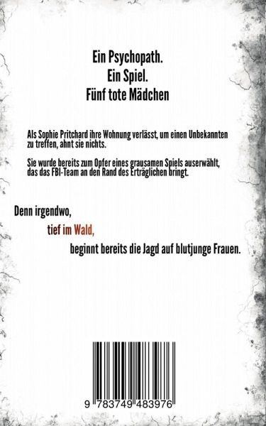 Ein Psychopath.Ein Spiel.Fünf tote Mädchen.Als Sophie Pritchard ihre Wohnung verlässt, um einen Unbekannten zu treffen, ahnt sie nichts.Sie wurde zum Opfer eines grausamen Spiels auserwählt, das das FBI-Team an den Rand des Erträglichen bringt.Denn irgendwo, tief im Wald beginnt bereits die Jagd auf blutjunge Frauen.Nach dem Erfolg von »Puppenbraut« und »Existenzlos« und »Der Angstheiler«, die die Bestsellerliste von Amazon in kurzer Zeit gestürmt haben, ist dies das vierte Buch aus der Serie um das FBI-Team, das von Scott Goodwin geleitet wird. Mays Bücher haben eine abgeschlossene Handlung und können voneinander unabhängig gelesen werden.