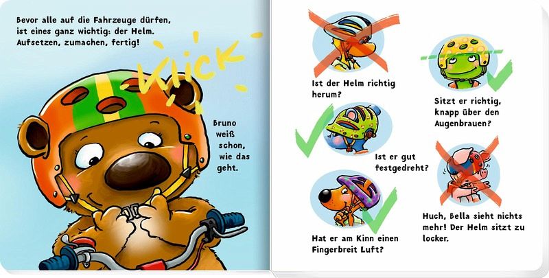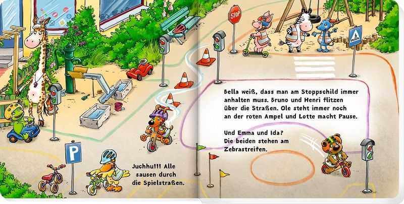 Aber auch das Bremsen will gelernt sein. Da muss die Erzieherin, eine Giraffe, die Trillerpfeife nutzen. Am Ende gibt es eine Urkunde und der kleine Leser, die kleine Leserin wird gelobt, weil er/sie sicher auch gut Bescheid wissen.