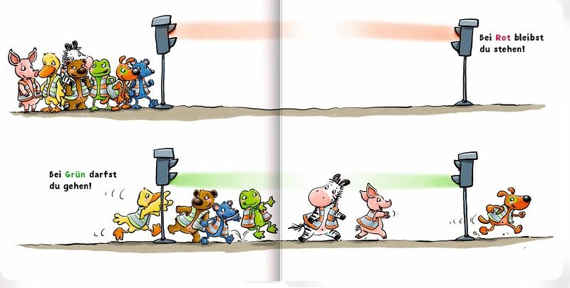 sich die Tierkinder schon aus. Die Kinder, die Fahrzeuge nutzen tragen einen Helm, es wird genau…mehrEine kleine Gruppe verschiedener Tierkinder steht am Zebrastreifen und wartet. Nach dem Gewusel vor der Kita beschließt die Erzieherin „Heute machen wir Verkehrserziehung!“