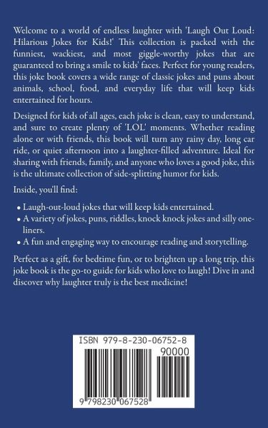 Welcome to a world of endless laughter with 'Laugh Out Loud: Hilarious Jokes for Kids!' This collection is packed with the funniest, wackiest, and most giggle-worthy jokes that are guaranteed to bring a smile to kids' faces. Perfect for young readers, this joke book covers a wide range of classic jokes and puns about animals, school, food, and everyday life that will keep kids entertained for hours. Designed for kids of all ages, each joke is clean, easy to understand, and sure to create plenty of 'LOL' moments. Whether reading alone or with friends, this book will turn any rainy day, long car ride, or quiet afternoon into a laughter-filled adventure. Ideal for sharing with friends, family, and anyone who loves a good joke, this is the ultimate collection of side-splitting humor for kids. Inside, you'll find:Laugh-out-loud jokes that will keep kids entertained. A variety of jokes, puns, riddles, knock knock jokes and silly one-liners. A fun and engaging way to encourage reading and storytelling. Perfect as a gift, for bedtime fun, or to brighten up a long trip, this joke book is the go-to guide for kids who love to laugh! Dive in and discover why laughter truly is the best medicine!