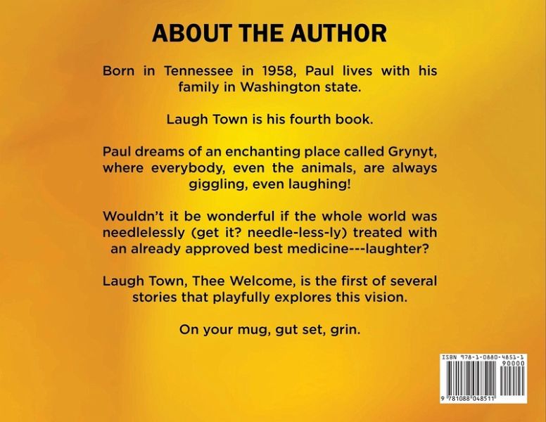 Born in Tennessee in 1958, Paul lives with his family in Washington state. Laugh Town is his fourth book. Paul dreams of an enchanting place called Grnyt, where everybody, even the animals, is always giggling, even laughing! Wouldn't it be wonderful if the whole world was needlessly (get it? needle-less-ly) treated with an already approved best medicine---laughter? Laugh Town, Thee Welcome, is the first of several stories that playfully explores this vision.