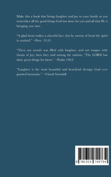 This book is a place to record the many times of laughter and joy you have as a family and create an account of your journey together. Record all the good times God has blessed you with as you walk through this life. Let the pages be filled with happy memories. Write down the funny stories, the challenges God brought you through, the victories and successes (both big and small), the miracles God worked out in your life, and any prophesies given. Life moves so very fast and if we don't write down the stories of the situations that made us who we are, we often forget or focus on the tough/bad stuff. Make this a book that brings laughter and joy to your family as you look at all the good things God has done for you and all that He is bringing you into. "A glad heart makes a cheerful face, but by sorrow of heart the spirit is crushed." ~Prov. 15:13 "Then our mouth was filled with laughter, and our tongue with shouts of joy; then they said among the nations, "The LORD has done great things for them." ~Psalm 126:2 "Laughter is the most beautiful and beneficial therapy God ever granted humanity." ~Chuck Swindoll Love always, laugh often, and grow together.