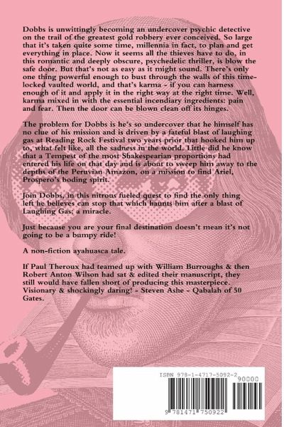 Dobbs is unwittingly becoming an undercover psychic detective on the trail of the greatest gold robbery ever conceived. So large that it's taken quite some time, millennia in fact, to plan and get everything in place. Now it seems all the thieves have to do, in this romantic and deeply obscure psychedelic thriller, is blow the safe door but that's not as easy as it might sound. There's only one thing powerful enough to bust through the walls of this time-locked vault system, and that's karma - if you can harness enough of it and apply it in the right way at the right time. Well, karma mixed in with the essential incendiary ingredients: pain and fear. Then the door can be blown clean off its hinges. A non-fiction ayahuasca tale. If Paul Theroux had teamed up with William Burroughs & then Robert Anton Wilson had sat & edited their manuscript, they still would have fallen short of producing this masterpiece. Visionary & shockingly daring! - Steven Ashe - Qabalah of 50 Gates.