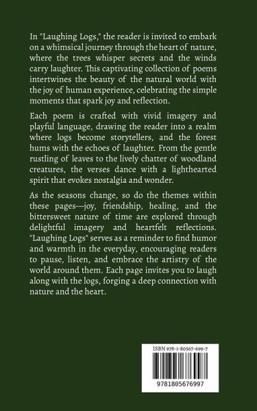 In "Laughing Logs," the reader is invited to embark on a whimsical journey through the heart of nature, where the trees whisper secrets and the winds carry laughter. This captivating collection of poems intertwines the beauty of the natural world with the joy of human experience, celebrating the simple moments that spark joy and reflection. Each poem is crafted with vivid imagery and playful language, drawing the reader into a realm where logs become storytellers, and the forest hums with the echoes of laughter. From the gentle rustling of leaves to the lively chatter of woodland creatures, the verses dance with a lighthearted spirit that evokes nostalgia and wonder. As the seasons change, so do the themes within these pages-joy, friendship, healing, and the bittersweet nature of time are explored through delightful imagery and heartfelt reflections. "Laughing Logs" serves as a reminder to find humor and warmth in the everyday, encouraging readers to pause, listen, and embrace the artistry of the world around them. Each page invites you to laugh along with the logs, forging a deep connection with nature and the heart.