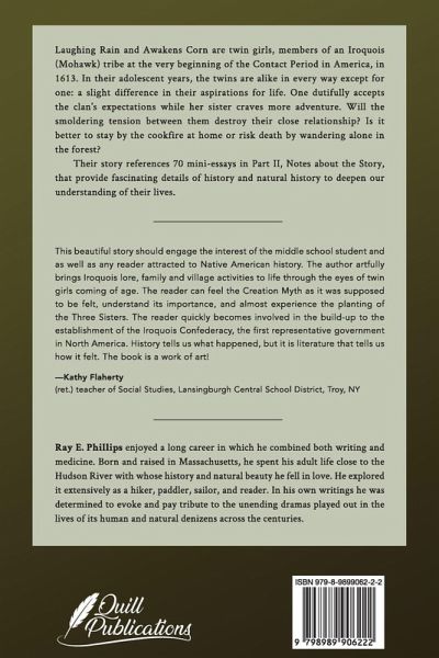 Laughing Rain and Awakens Corn are twin girls, members of an Iroquois tribe at the very beginning of the Contact Period in America. In their adolescent years, the twins are alike in every way except for one: a slight difference in their aspirations for life. One dutifully accepts the clan's expectations while her sister craves more adventure. Will the smoldering tension between them destroy their close relationship? Is it better to stay by the cookfire at home or risk death in solitary wandering in the forest? Daily life in a Mohawk-Iroquois village high in the Adirondack Mountains in the year 1616 is vividly portrayed in this book, and with it, the strict separation of gender roles. The girls begin to experience the impact of colonialism with the visit of a missionary to their village. Find out about the rules and traditions that define this society and think about what you have in common with Laughing Rain and Awakens Corn. It seems that teenagers more than 400 years ago were not much different from young people today. See if you agree! And while you are doing that, ask yourself whether you, alone, would be able to survive for several days in the mountains. Would you know how to make a clay pot, identify a poisonous mushroom, or even confront a bear? Their story references 70 mini-essays in Part II: NOTES ABOUT THE STORY that provide fascinating details of history and natural history to deepen our understanding of their lives and find connections with our own.