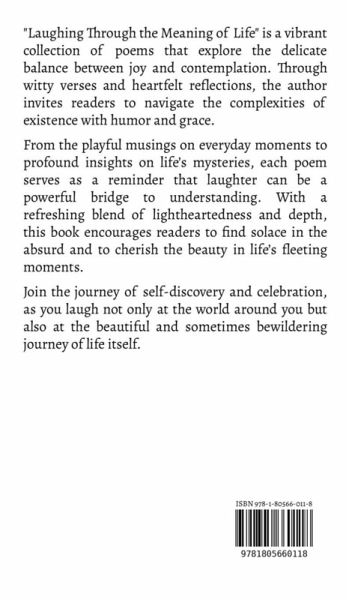 "Laughing Through the Meaning of Life" is a vibrant collection of poems that explore the delicate balance between joy and contemplation. Through witty verses and heartfelt reflections, the author invites readers to navigate the complexities of existence with humor and grace. From the playful musings on everyday moments to profound insights on life's mysteries, each poem serves as a reminder that laughter can be a powerful bridge to understanding. With a refreshing blend of lightheartedness and depth, this book encourages readers to find solace in the absurd and to cherish the beauty in life's fleeting moments. Join the journey of self-discovery and celebration, as you laugh not only at the world around you but also at the beautiful and sometimes bewildering journey of life itself.