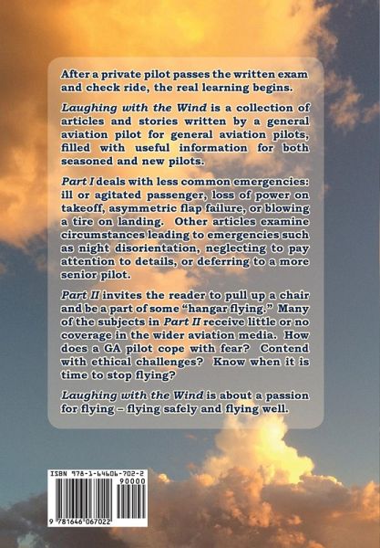 After a private pilot passes the written exam and check ride, the real learning begins. Laughing with the Wind is a collection of articles and stories written by a general aviation pilot for general aviation pilots, filled with useful information for both seasoned and new pilots. Part I deals with less common emergencies: ill or agitated passenger, loss of power on takeoff, asymmetric flap failure, or blowing a tire on landing. Other articles examine circumstances leading to emergencies such as night disorientation, neglecting to pay attention to details, or deferring to a more senior pilot. Part II invites the reader to pull up a chair and be a part of some "hangar flying." Many of the subjects in Part II receive little or no coverage in the wider aviation media. How does a GA pilot cope with fear? Contend with ethical challenges? Know when it is time to stop flying? Laughing with the Wind is about a passion for flying – flying safely and flying well.