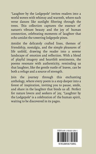 "Laughter by the Lodgepole" invites readers into a world woven with whimsy and warmth, where each verse dances like sunlight filtering through the trees. This collection captures the essence of nature's vibrant beauty and the joy of human connection, celebrating moments of laughter that echo amidst the towering lodgepole pines. Amidst the delicately crafted lines, themes of friendship, nostalgia, and the simple pleasures of life unfold, drawing the reader into a serene landscape of emotion and reflection. With a blend of playful imagery and heartfelt sentiments, the poems resonate with authenticity, reminding us that laughter, like the gentle rustle of leaves, can be both a refuge and a source of strength. Join the journey through this enchanting anthology, where every poem is a step deeper into a forest of inspiration, inviting you to pause, smile, and share in the laughter that binds us all. Perfect for nature lovers and seekers of joy, "Laughter by the Lodgepole" is a celebration of the human spirit, waiting to be discovered in its pages.