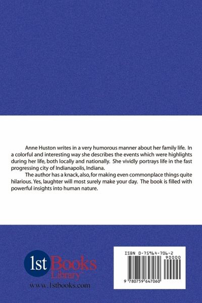 Anne Huston writes in a very humorous manner about her family life. In a colorful and interesting way she describes the events, which were highlights during her life, both local and national. Yes, laughter will most surely make your day!