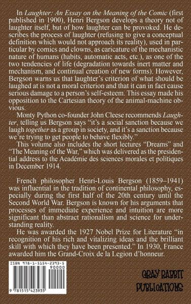 In Laughter: An Essay on the Meaning of the Comic (first published in 1900), Henri Bergson develops a theory not of laughter itself, but of how laughter can be provoked. He describes the process of laughter (refusing to give a conceptual definition which would not approach its reality), used in particular by comics and clowns, as caricature of the mechanistic nature of humans (habits, automatic acts, etc.), as one of the two tendencies of life (degradation towards inert matter and mechanism, and continual creation of new forms). However, Bergson warns us that laughter's criterion of what should be laughed at is not a moral criterion and that it can in fact cause serious damage to a person's self-esteem. This essay made his opposition to the Cartesian theory of the animal-machine obvious. Monty Python co-founder John Cleese recommends Laughter, telling us Bergson says "it's a social sanction because we laugh together as a group in society, and it's a sanction because we're trying to get people to behave flexibly." This volume also includes the short lectures "Dreams" and "The Meaning of the War," which was delivered as the presidential address to the Académie des sciences morales et politiques in December 1914. French philosopher Henri-Louis Bergson (1859-1941) was influential in the tradition of continental philosophy, especially during the first half of the 20th century until the Second World War. Bergson is known for his arguments that processes of immediate experience and intuition are more significant than abstract rationalism and science for understanding reality. He was awarded the 1927 Nobel Prize for Literature "in recognition of his rich and vitalizing ideas and the brilliant skill with which they have been presented." In 1930, France awarded him the Grand-Croix de la Legion d'honneur.