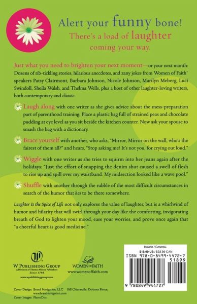 Producing everything from gentle chuckles to roll-in-the-aisle laughter, these stories, jokes, and quips will entertain and uplift you, no matter what your circumstances might be! This "spice-rack" of laughter includes hilarious jokes, quips, and anecdotes from some of the funniest and best-known Women of Faith(R) speakers, including: * Patsy Clairmont * Barbara Johnson * Nicole Johnson * Marilyn Meberg * Jan Silvious * Luci Swindoll * Kathy Troccoli * Sheila Walsh * Thelma Wells and others!