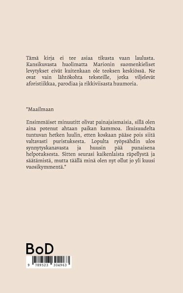 Tämä kirja ei tee asiaa tikusta vaan laulusta. Kansikuvasta huolimatta Marionin suomenkieliset levytykset eivät kuitenkaan ole teoksen keskiössä. Ne ovat vain lähtökohta teksteille, jotka viljelevät aforistiikkaa, parodiaa ja rikkiviisasta huumoria.
